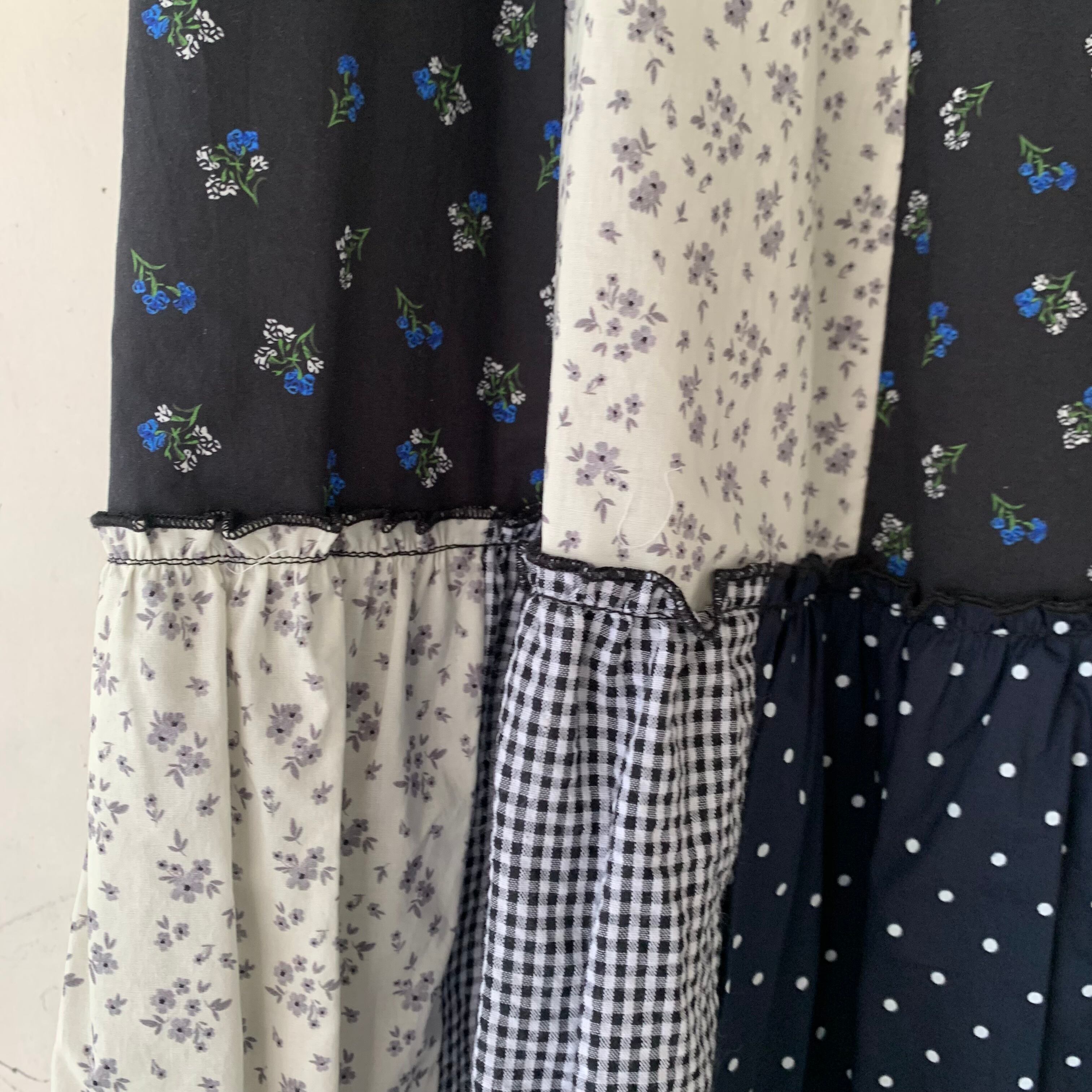 小花柄、ドット、ギンガムチェックを組み合わせた贅沢なパッチワーク。